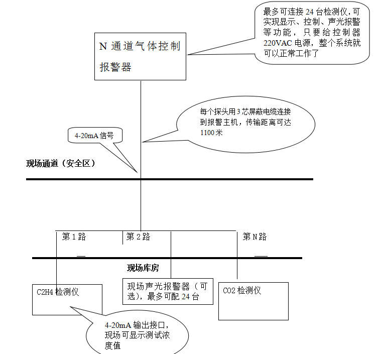 現(xiàn)場 C2H4和CO2變送器傳過來的4-20mA信號全部連接到N通道氣體控制報警器上,當某一路C2H4和CO2檢測儀發(fā)出報警信號時(同時有繼電器輸出,可觸發(fā)風機或乙醇產(chǎn)生機開關(guān)),提供給監(jiān)控人員分級的聲光報警,如果有需要,可以將監(jiān)控主機通過網(wǎng)絡(luò)將數(shù)據(jù)傳輸?shù)狡渌O(jiān)控中心。在現(xiàn)場可以實時顯示C2H4和CO2的濃度,也可以在每一個探頭附近裝一個聲光報警器,當現(xiàn)場發(fā)生報警時可以通知人員快速處理或撤離。